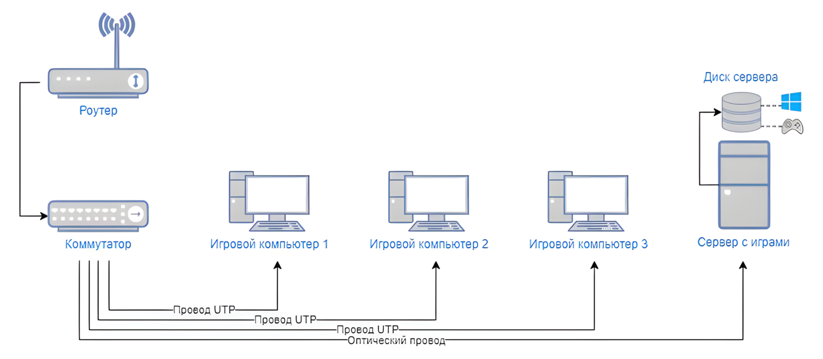 Сервер подключён ко всем ПК в клубе и, когда гость запускает компьютер, на него подгружается операционная система (прямо в оперативную память), игры и все остальные программы.