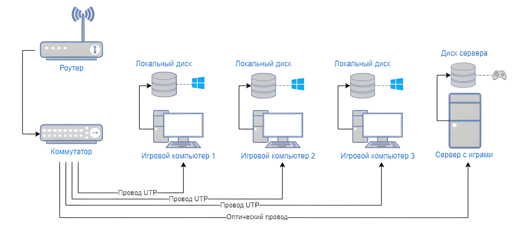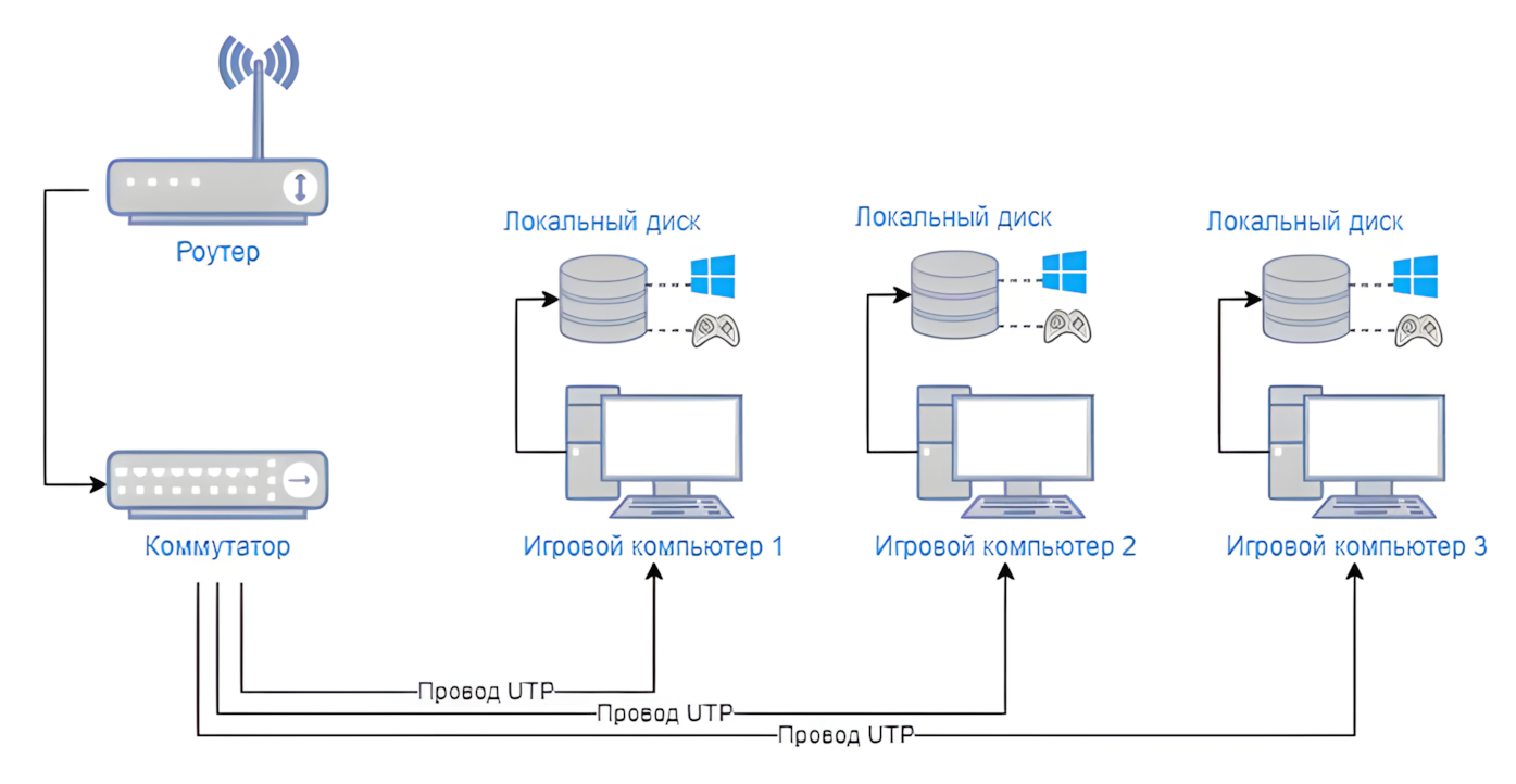 Дисковая система самая понятная и простая: в каждом компьютере стоит свой диск, на который установлена как система, так и все игры. Это самая первая система управления, которая работает ещё с 90-ых годов, и её выбор был обусловлен техническими ограничениями (слабая сеть, низкая скорость и отсутствие технологий).